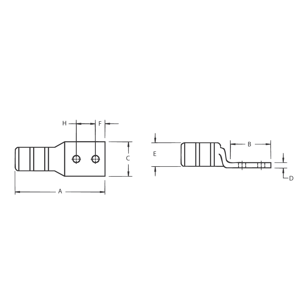 Copper Two-Hole Lug, Long Barrel, Blind End, Max 35kV, #6 AWG Wire, 1/4 Inch Bolt Size, 5/8 Inch Hole Spacing, Tin Plated, Die Code 24, Die Color Code Blue